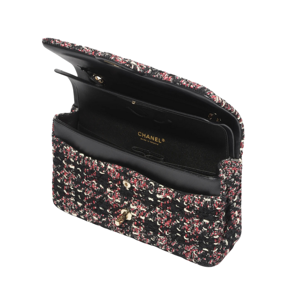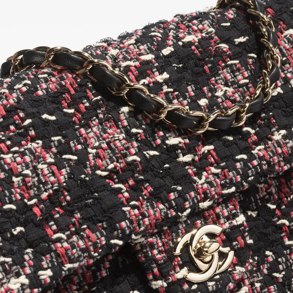 through a refined combination of premium tweed fabricand a bold black and red color palette.