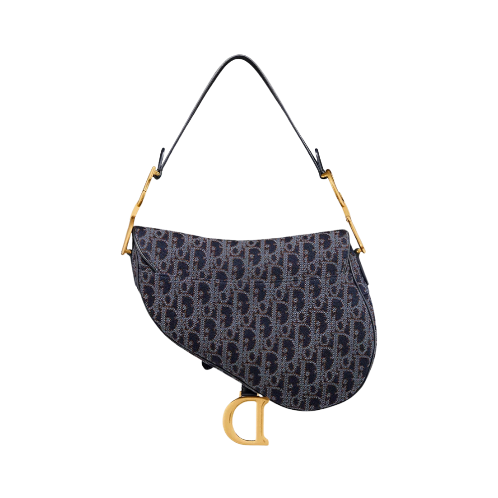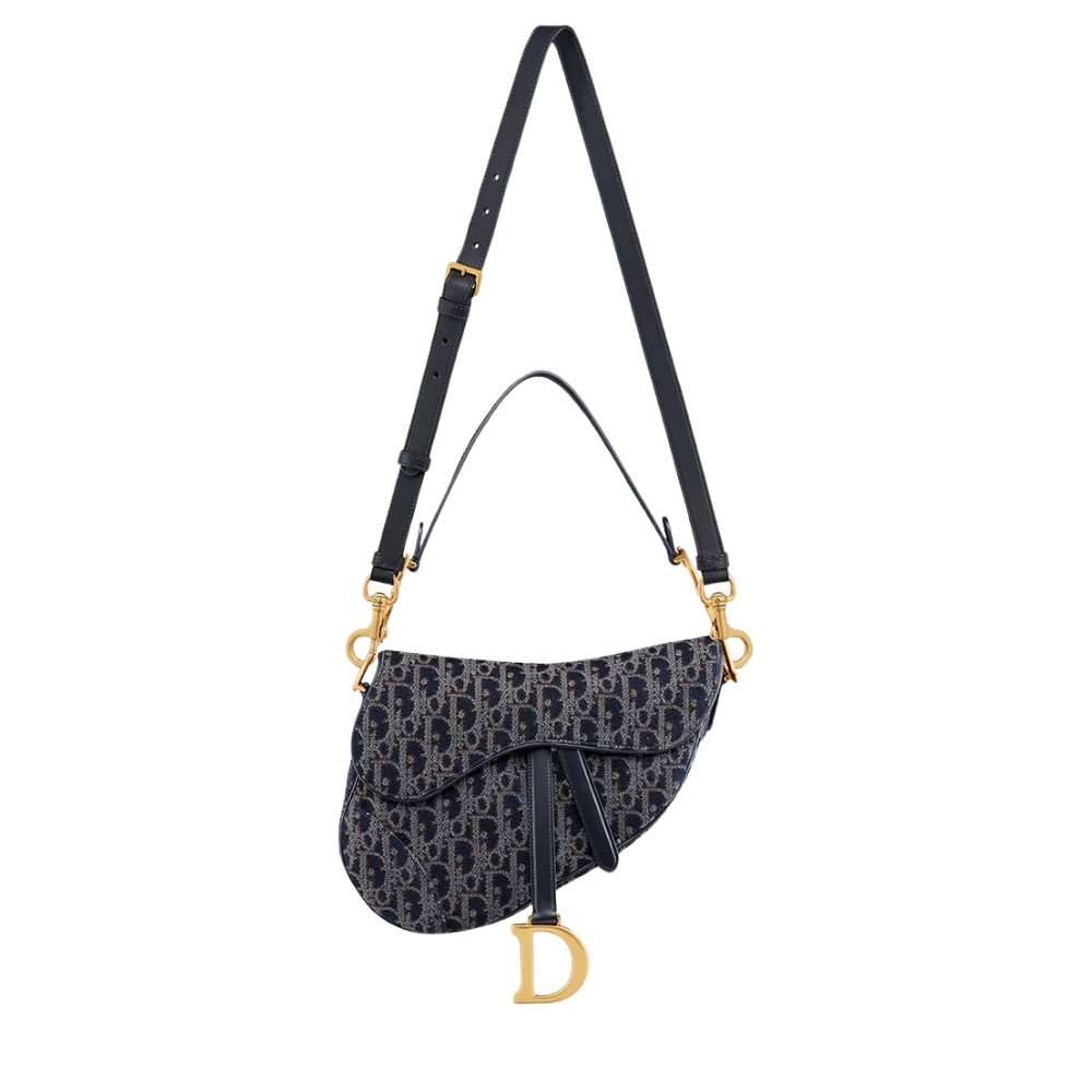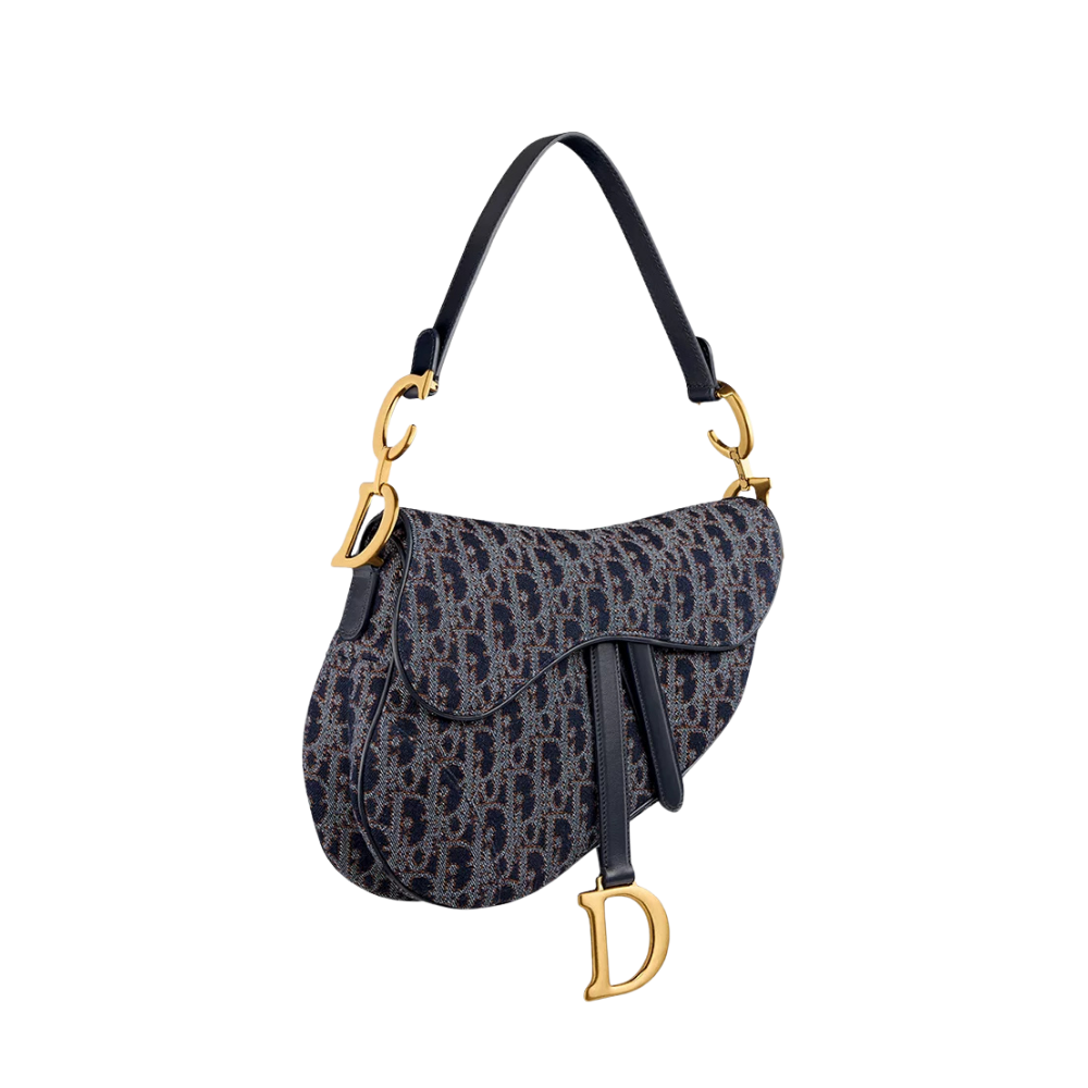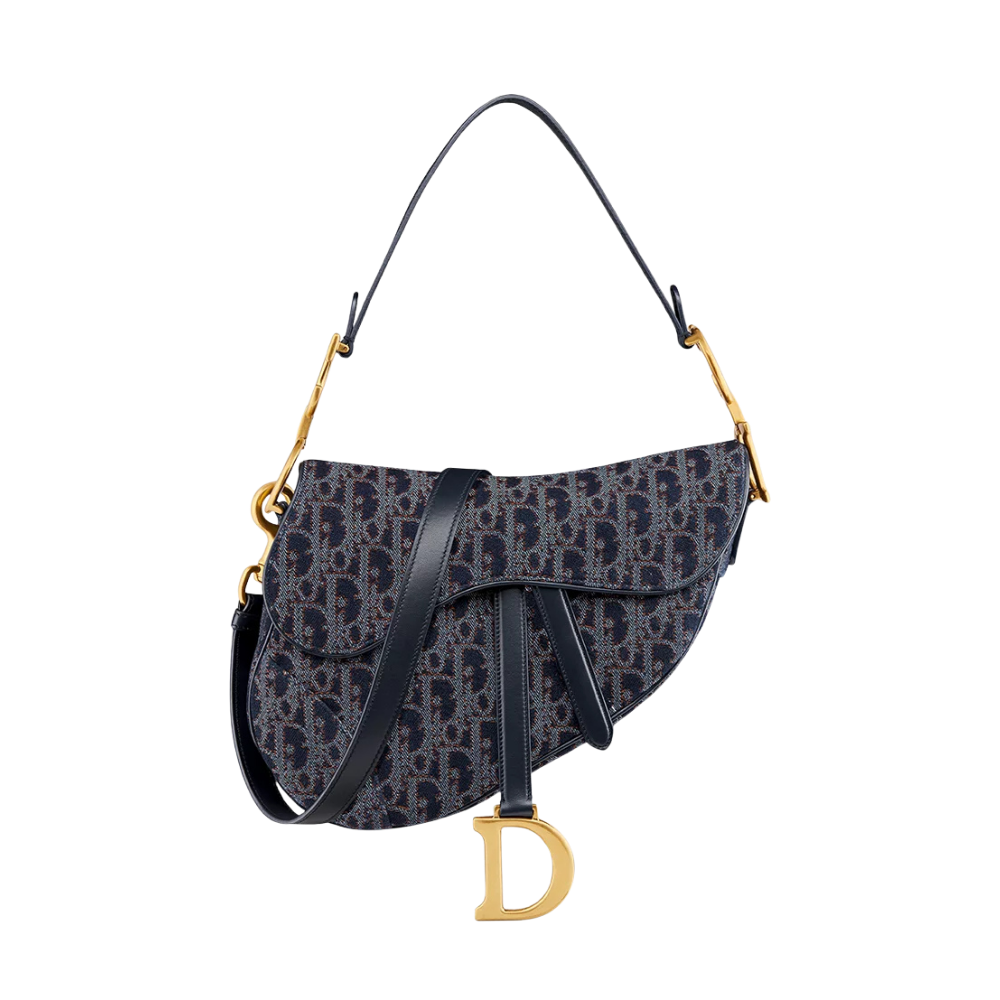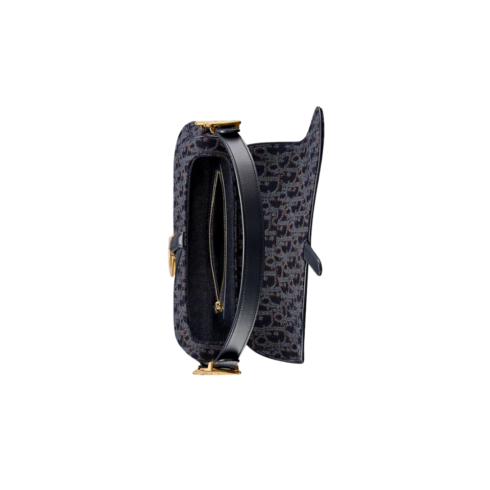 Saddle Bag with Strap M0455CDJB_M928 reimagines Dior’s iconic saddle silhouette through a modern denim-inspired aesthetic. The blend of blue and tobacco brown tones delivers a youthful yet refined look, evoking craftsmanship and individuality. Contrasting stitching inspired by denim edge detailing, paired with the gold-tone “D” logo, adds visual depth while maintaining an elegant balance.